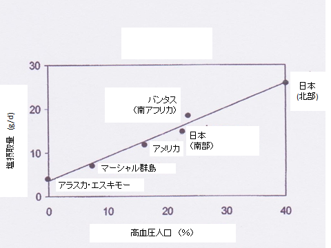 図1 集団間の塩摂取量と高血圧との直線関係を“証明した”ダールの発表。作図に用いたデータの発表がないにもかかわらず、この図は長い間、塩-血圧神話の基礎であった。