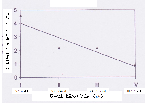 図2 尿中ナトリウム排泄量の四分位数と心筋梗塞発症率との直線回帰に適合、アルダーマンらは高血圧男性の前向きコホート研究からのデータで有意な直線傾向を示した。