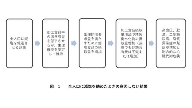 同時的に、加工食品は塩についての主要給源源ではないが、精製された炭水化物の高い摂取源である:すなわち、様々な糖類や消化によって糖類が上昇する。基礎科学、人口研究、臨床試験からのエビデンスに無理に従わせることは高血圧発症の主要な役割を演ずるとして糖類と特にモノサッカライドであるフラクトースに影響を与える。さらに、一般的に糖類、特にフラクトースは様々な機構を通して総合的な心血管危険率に寄与するかもしれないことをエビデンスは示唆している。加工食品の塩含有量を下げることは澱粉や糖類の摂取量を増加させることになり、それによって高血圧や循環代謝疾患が増加する(図1)。