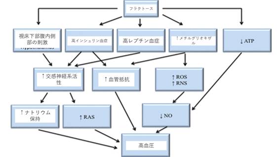 ラットにスクロースを給餌することは交感神経系(SNS)を刺激する。そのことは心拍数、レニン分泌、腎臓ナトリウム保持、血管抵抗を増加させることになる。これらの効果の全ては血圧を上昇させるように相互作用し、事実、ラットにスクロースを給餌することは血圧を上昇させる。スクロース給餌は幅広い代謝機能不全の一部としてインスリン抵抗性のような他の変化も誘因する。さらに、砂糖またはHFCSの摂取は高レプチン血症、メチルグリオキザールの上昇、ATPの低下のような他の機構を通して血圧上昇をもたらすかもしれない(図2)。図2はフラクトースが高血圧に寄与しているかもしれない可能性のある機構を述べている。