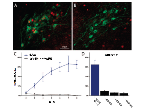 図1 核孤独のアルドステロン感受性11-β-ヒドロオキシステロイド・デヒドロゲナーゼ・タイプ2(HSD2)神経は塩欠乏で活性化され、塩摂取で不活性化される。2,3の選択された細胞タイプに特有な塩摂取に対するこれらの細胞の感受性はほとんどの細胞系に一般的な細胞外液区画のナトリウム濃度変化に対する感受性と対照されるべきである。(A) 塩のない餌を与えられたラットで、HSD2神経は神経活性指標のc-Fos(赤)の発現を劇的に増加させる。(B) 塩欠乏ラットが1日高塩餌に切り替えられると、c-Fos免疫反応はHSD2神経で実質的になくなる。(C) c-Fos活性を示すHDS2神経のパーセントは8日間の塩欠乏餌で次第に増加する。対照的に、ラットが塩を含む水(3%塩化ナトリウム溶液)を自発的に飲めば、HSD2神経の活性化(c-Fos発現のパーセント)は急速に消える。