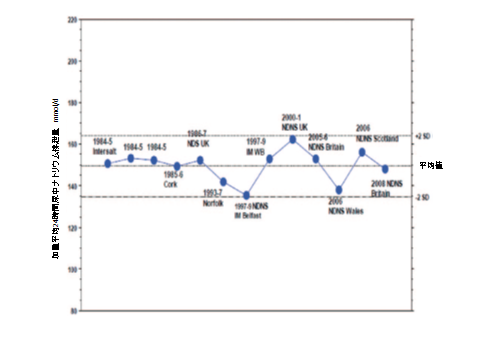 図2は1984年から1985年にインターソルトの調査場所であるベルファースト、バーミンガム、サウスウェールスで始めた13調査の平均24時間尿中塩排泄量(平均値±2SD)を示している。各調査は実質的に男女参加者の同一表示とした。いくつかの点が明らかである。第一に、24時間尿中塩排泄量としたがって、イギリスの塩摂取量はこれらの調査を行った25年間で極わずかしか変わらなかった。1984年から1985年の期間で平均(±SD)塩摂取量は8.8±0.4 g/dであった。第二に、多数の試料を提供した6300人以上がイギリスやアイルランドの各地から24時間尿中塩排泄量の測定値を提供しており、それらは比較的狭い範囲内にある。