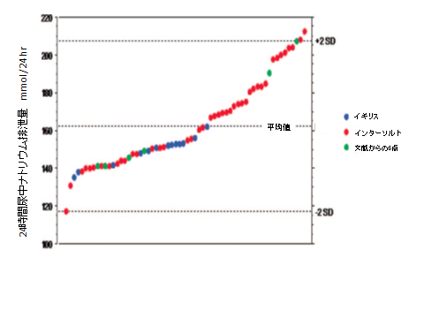 この解析でイギリス調査のいくつかは有名なインターソルト研究に含まれた。その結果、調査は32ヶ国の52ヶ所で10,079人の成人で行われた。インターソルトの著者らは飛び地として4ヶ所の収集場所からのデータを確認し、残りの48ヶ所の解析は、2ヶ所の追加場所が収集平均値よりも2SD大きい24時間尿中塩排泄量を示すことを明らかにした。最近のレビューは、FSAとインターソルトの方法に類似した方法で収集した24時間尿中塩排泄量の6件の追加データセットを確認した。図3はインターソルトからの残りの46ヶ所のそれぞれについての平均24時間尿中塩排泄量を示しており、それにはイギリスの3ヶ所、前述した追加の6データセット、図2に示した主としてFSAに由来するイギリスの調査の平均値を含んでいる。24時間尿中塩排泄量の地域的に異なった62試料(n=19,151)の混合調査は最低値6.8 g/dと最高値12.3 g/d、平均値9.4 g/dと言う成人の塩摂取量範囲を」述べている。