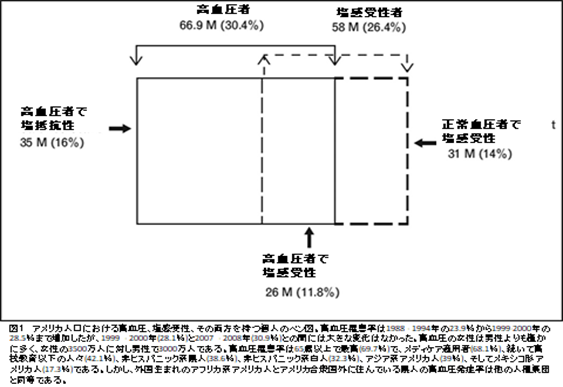 ● 高血圧患者と正常血圧患者における血圧の塩感受性は発症率、認識、治療または治療に対する応答に関する発表された統計には含まれていない。血圧とは関係ない塩感受性は心血管罹患率と死亡率および他の疾患、例えば、喘息、胃がん、骨粗鬆症、腎不全の危険因子である。