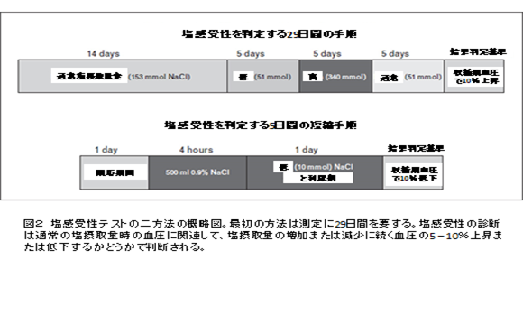世界人口の1/3は高血圧で、それは脳卒中または冠状心疾患による死亡のほぼ50%の原因となっている。これらの統計は塩抵抗性高血圧と塩感受性高血圧を区別していないか、または血圧に関係のない塩感受性が心血管疾患とガンを含めて他の疾患の危険因子あるとしても塩感受性である正常血圧者を含めている。本レビューは塩感受性用の新しい個人的な診断法を述べる。