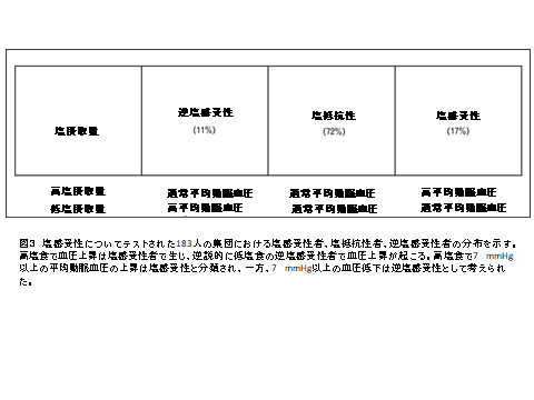 ● 本態性高血圧の有無による患者の塩感受性は、ランダムな塩摂取量で140/90(収縮期血圧/拡張期血圧)mmHg以下の血圧で定義される特に塩感受性正常血圧患者では臨床的に記録されていない。アメリカ人口のほぼ半分が塩感受性であるかもしれない。