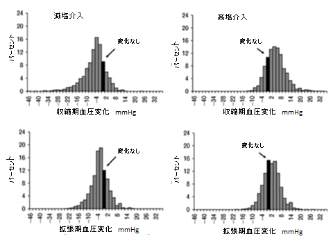 ヒトのSSBPに関する研究はSSとSRの齧歯類系統に二分する研究よりもずっと複雑であった。その理由は、血圧測定の無作為な誤差のような方法論的問題と血圧変動についての多数の要因のような生理学的問題が塩負荷や塩欠乏に対する血圧応答の調査を混乱させるかもしれないからである。さらに、図1に示すように、ヒトのSSBPは連続的で通常分布した特徴をしている。したがって、SSまたはSRのようにそれぞれを定義することは血