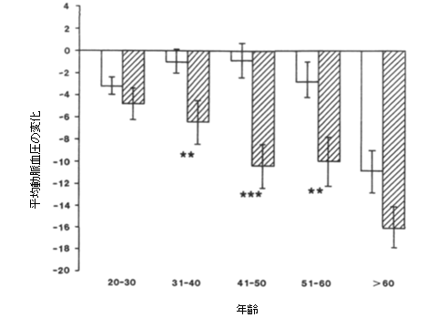 図2 10歳刻みの異なった年齢で正常血圧者(白抜き棒)と高血圧者(斜線棒)の減塩に応じた平均動脈血圧低下。いくつかの10歳刻みで正常血圧者よりも高血圧者大きな血圧応答についての統計的な有意性をアスタリスクは示す。左から右へ次第に長くなっている棒は、加齢の影響が正常血圧者と高血圧者の両方で血圧応答を増加させたことを示している。WeinbergerとFinebergから再版。