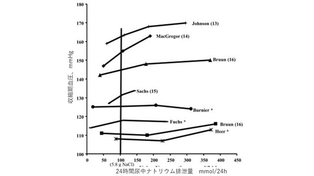 保健機関によって勧められている5.8 g/dと言う上限塩摂取量は医学研究所の報告書から始まっており、報告書は次のように述べている、“上限値の決定に最も関係しているのは3試験で、そこでは塩摂取量の最低値が十分な摂取量に近似していた。これら3試験からの結果を考慮して、塩摂取量で観察された最低の悪い効果を及ぼす値を5.8 g/dに設定した。”3 – 4種類の塩投与量に対して個人をランダム化したこれら3件の研究(投与量応答解析)の全ては、5.8 g/dより低い摂取量と高い摂取量の両方で、摂取量の増加に伴って意味のある比例的な増加を示した、したがって、塩摂取量は5.8 g/d以下にすべきであるという結論を正当化した。図1は医学研究所の評価時に発表されていた全ての既知の投与量応答研究を示している。医学研究所によって考察された3研究は全て老齢の高血圧者による研究で、一番急な投与量応答関係を示した研究であった。最低の投与量応答関係を示した老齢高血圧者による研究と投与量応答関係を示さない4件の正常血圧者研究(図1)は評価に含まれなかった。この選択的な算入は、高血圧と年齢は3件の選択された研究を偏向させている事実によってさらに強化された。