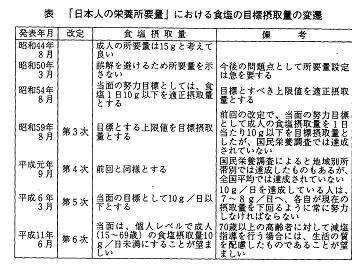 g以下が推奨され、日本では10 g未満が推奨されている。平成9年では成人1日あたり平均摂取量13.5 gと依然過剰摂取の状況にあることから、平均摂取量10 g未満を目標とする」。また、3月24日には農林水産省・文部省・厚生省の策定による『食生活指針の推進について』の閣議決定があり、こちらでも「塩辛い食品を控えめに、食塩は1日10 g未満にしましょう」との数値目標が打ち出されています。しかしいずれもその根拠は明確ではなく、ただこれまでのスローガンの繰り返しの感じで、新しい知見もありません(報告書には付録として“高血圧予防の観点からの食塩摂取量について”[厚生省「第6次改定日本人の栄養所要量ー食事摂取基準」より一部抜粋]が掲載されており、『食塩摂取量が血圧におよぼす影響には、個人差が大きい。集団レベルでは、アフリカ系米国人、高齢者、高血圧患者、糖尿病患者には食塩感受性者が多いという。しかし、食塩感受性(個人)をあらかじめ識別する方法は、現時点ではない。一方、中等度の減塩(6 g/日)により、有害な影響が出現したという報告はない。さらに中等度の減塩により、降圧薬服薬量の減少、降圧利尿薬によるカリウムの排泄が抑制されること、左室肥大の改善、骨粗鬆症や腎結石の予防等の利点も認められている』とありますが……)。
