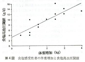 食塩と高血圧との関係は全体的には弱い.しかし,食塩摂取量が多いと血圧が上昇する人がおり(食塩感受性の人),そのような人は高血圧者,肥満者,老人に多い.高血圧は遺伝性であるので,高血圧家系の人は食塩と関係ない場合もあるが,取り敢えず医者の管理下で減塩する.高血圧家系でない健康な人は食塩摂取量を気にする必要はない.