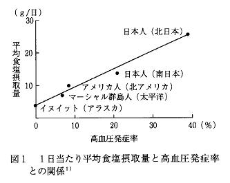 疫学調査は因果関係を推定する手段すぎない。食塩と高血圧との関係も,疫学調査に基づいて因果関係があると推定されているが,臨床的に証明され結論付けられたわけではない。多くの疫学調査があり,Gleibermanは27集団の研究結果をまとめて,大きなばらつきの中で食塩摂取量と血圧との関係を推定する実験式まで発表している18)が,同じ条件ではないので評価できない。そこで,条件,方法を厳密に規定して,調査対象も多数の拠点で広範囲に行ったインターソルト・スタデイの結果が発表された。これについてはいろいろと議論があるので,別項で述べる。