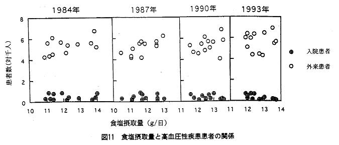このデータを利用して食塩摂取量と高血圧性疾患および脳血管疾患についてそれぞれ図11と12に示した.いずれも1984年からの4か年のデータを表しているが,両疾患とも食塩摂取量に関係ないことが分かる.