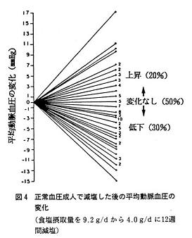 減塩による介入試験を始めてみると,全体的に平均すると,減塩による血圧低下の効果があっても,個別の人についてみると減塩で血圧が逆に上昇する人がいることが分かった.図4は正常血圧者について,食塩摂取量を9.2グラムから4.0グラムに12週間減塩させた時の平均動脈血圧の変化を示している.