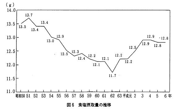 厚生省は毎年,「国民栄養の現状」として調査結果を発表し,その一項目に食塩摂取量が取り上げられている.この調査は,全国の300地区,6,000所帯,約20,000人を対象に,11月の連続した3日間の食品摂取量を調査する.食べた食品中のナトリウム量を食品成分表より調べて集計し,その値を2.54倍して食塩摂取量とする.